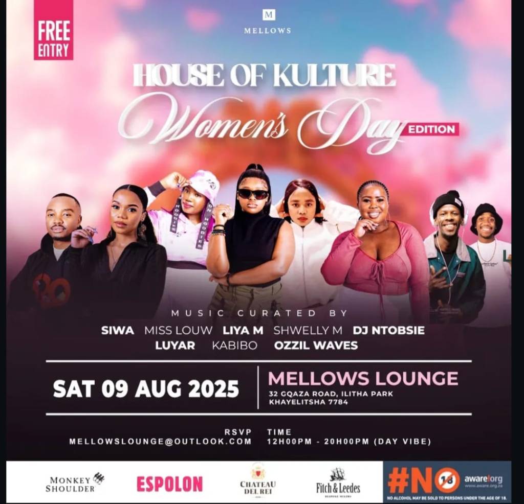 Cape Town, South Africa – 7 August 2025 – This Women’s Day, Mellows Lounge is proud to present the House of Kulture: Women’s Day Edition — a vibrant celebration of music, culture, and womanhood, happening on Saturday, 9 August 2025, from 12PM to 8PM in the heart of Khayelitsha.
